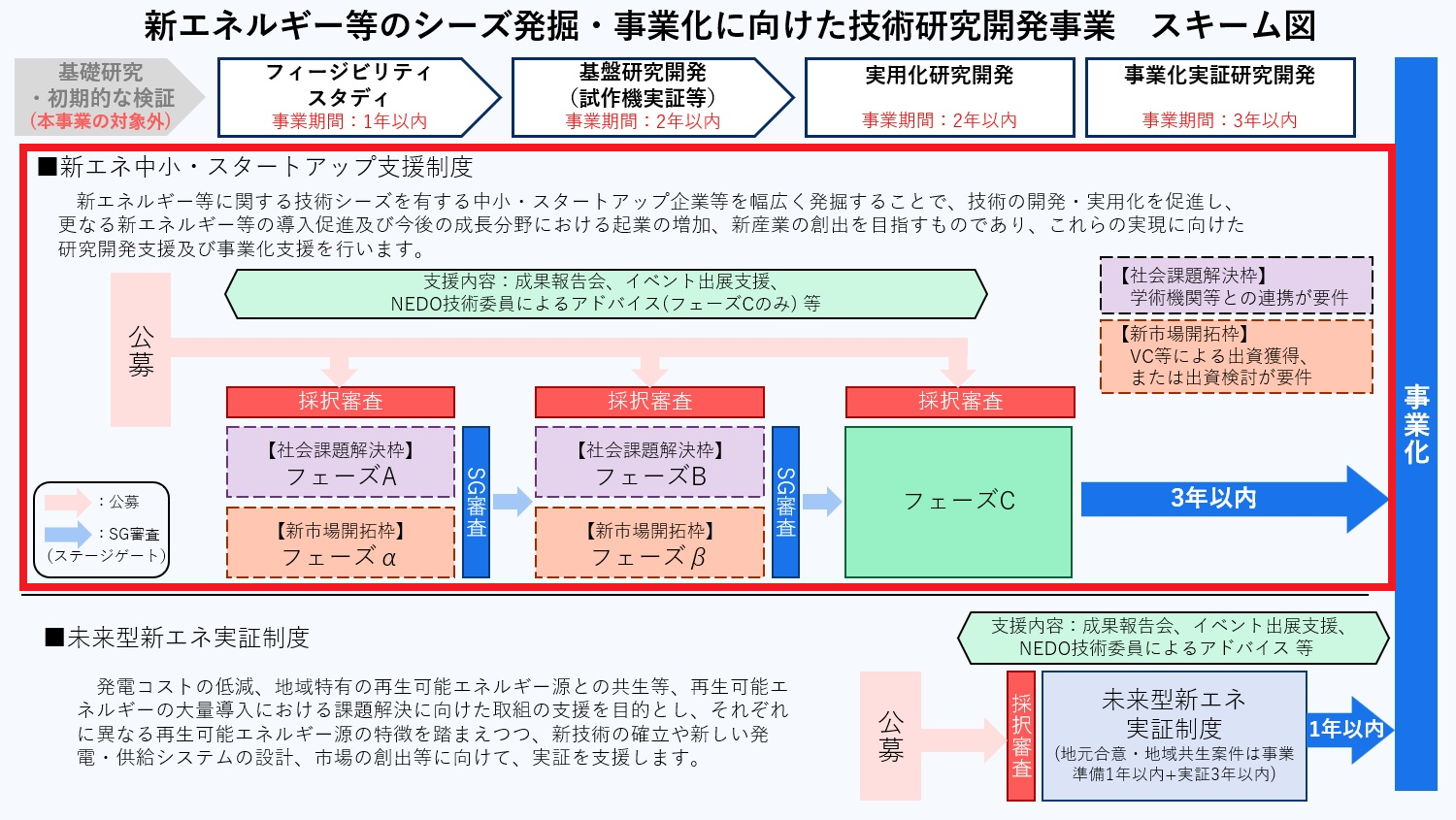 対象となる事業:本事業は2種の制度で構成され、本公募は「新エネ中小・スタートアップ支援制度」です。もう一方の「未来型新エネ実証制度」はこちらをご覧ください。