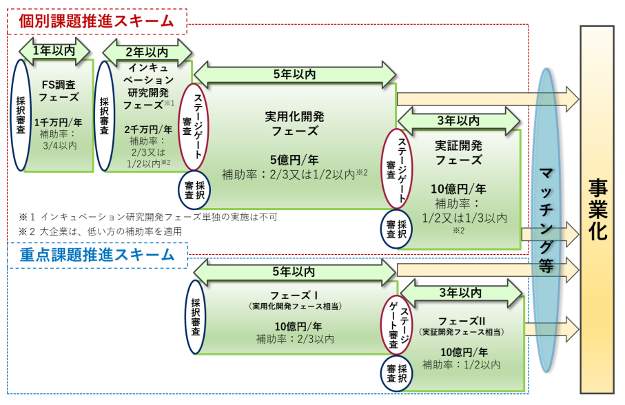 期間:5年以内 補助率:中小・中堅 2/3、大企業 1/2 上限:5億円/年(NEDO補助費+実施者負担分) - 実証開発フェーズ: