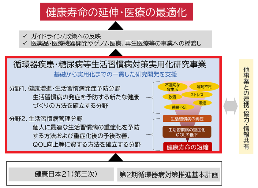 生活習慣病の病態解明や予防法・治療法などの研究開発を推進し、健康寿命延伸や医療・医療費を最適化すること。
